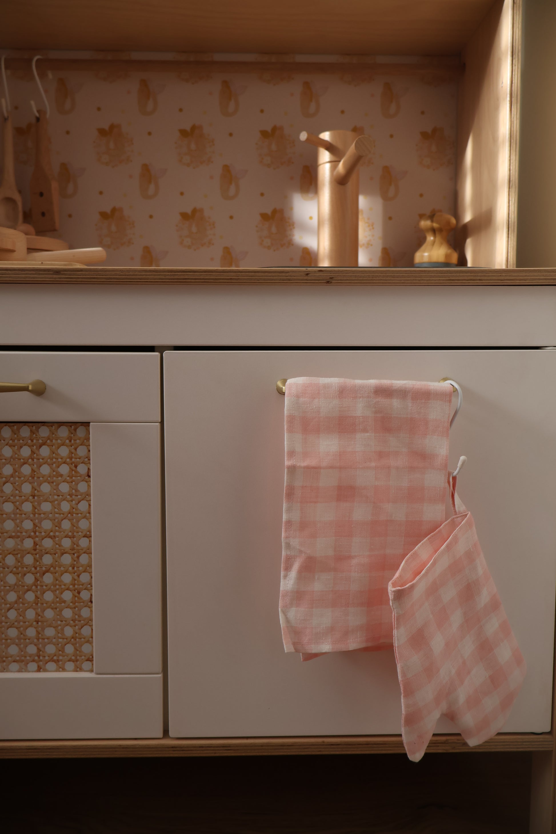 This adorable blush gingham oven mitt is fully lined, whilst the tea towel features an underside of our beautiful blush larger checkered pattern. Sized perfectly to hang over smaller play kitchen handles, you no longer need to search high and low for the right sized toddler tea towel, usually in less than ideal prints....